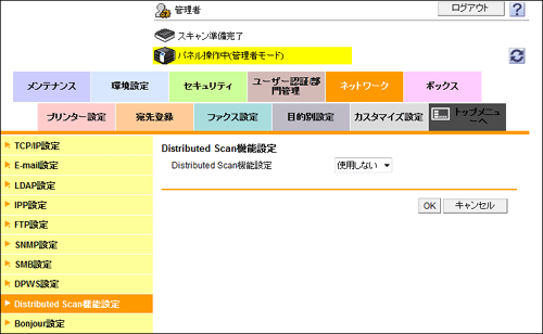 管理者モードの[ネットワーク]-[Distributed Scan機能設定]で、[Distributed Scan機能設定]を[使用する]に設定します(初期値:[使用しない])。