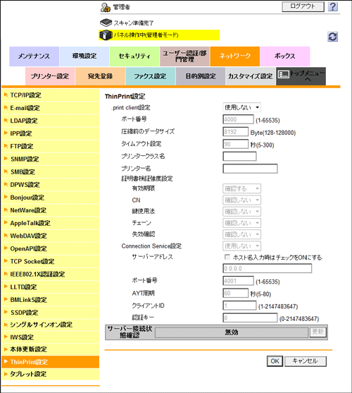 管理者モードの[ネットワーク]-[ThinPrint設定]で、次の設定をします。