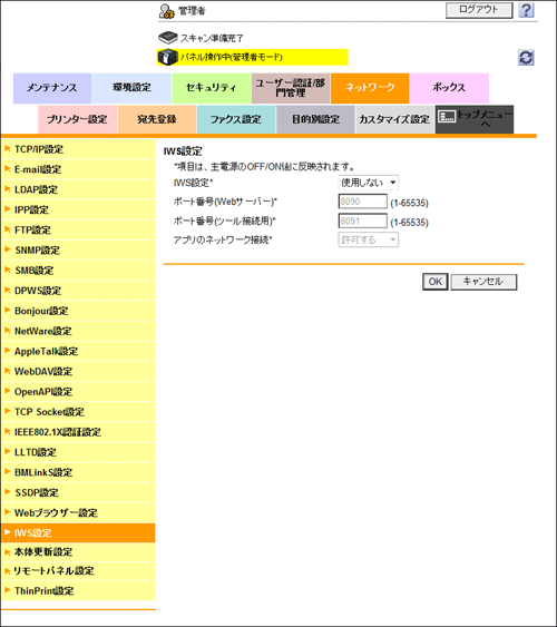 管理者モードの[ネットワーク]-[IWS設定]で、次の設定をします。