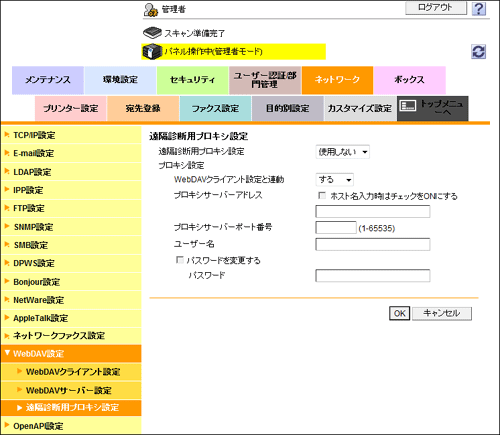 管理者モードの[ネットワーク]-[WebDAV設定]-[遠隔診断用プロキシ設定]で、次の設定をします。