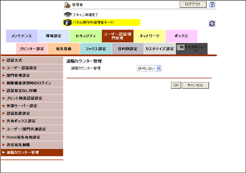 管理者モードの[ユーザー認証/部門管理]-[遠隔カウンター管理]で[遠隔カウンター管理]を[許可する]に設定します(初期値:[許可しない])。
