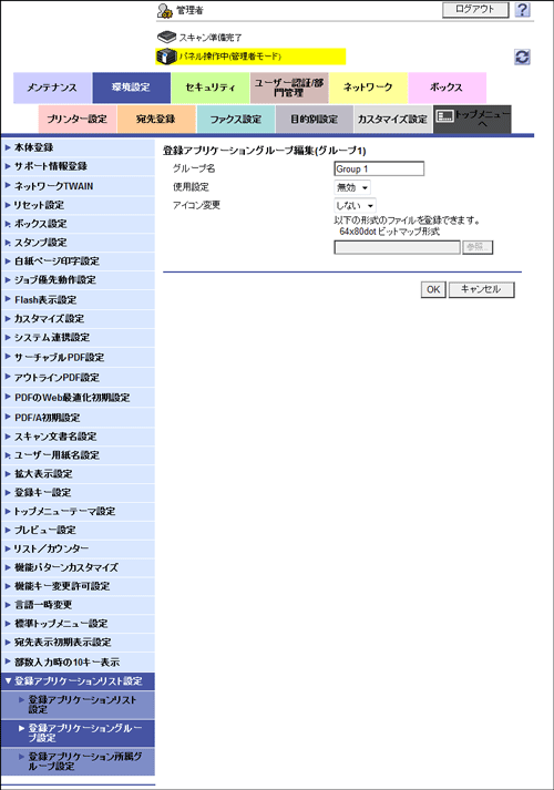 管理者モードの[環境設定]-[登録アプリケーションリスト設定]-[登録アプリケーショングループ設定]で、新しく登録するグループの[編集]をクリックします。