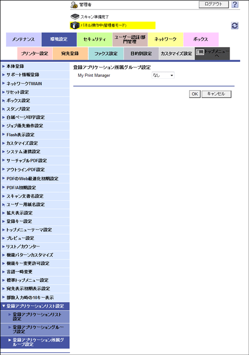 管理者モードの[環境設定]-[登録アプリケーションリスト設定]-[登録アプリケーションリスト設定]で、次の設定をします。