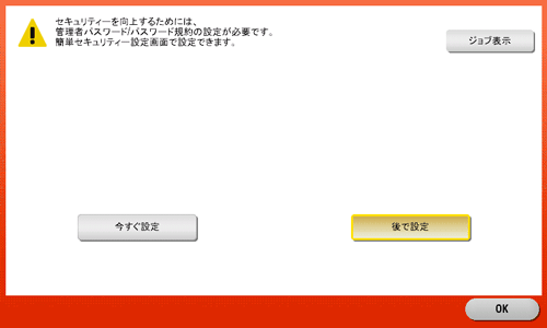 また、管理者パスワードが初期値から変更されていない場合や、パスワード規約の条件を満たしていない場合に、操作パネルにセキュリティ警告画面を表示し、パスワード規約の条件を満たした管理者パスワードへの変更を促すことができます。