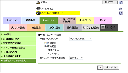管理者モードの[セキュリティ]-[簡単セキュリティー設定]で、次の設定をします。
