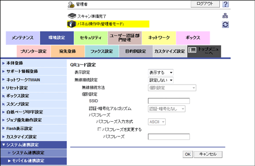 管理者モードの[環境設定]-[システム連携設定]-[モバイル連携設定]-[QRコード設定]で、次の設定をします。