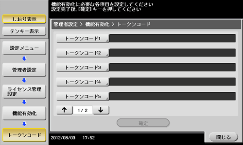 [設定メニュー]-[管理者設定]-[ライセンス管理設定]-[機能有効化]-[トークンコード]で、トークン番号を入力します。