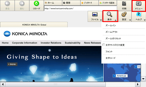 ツールバーの[メニュー]-[表示]で、ページの拡大縮小、文字コードの変更などができます。
