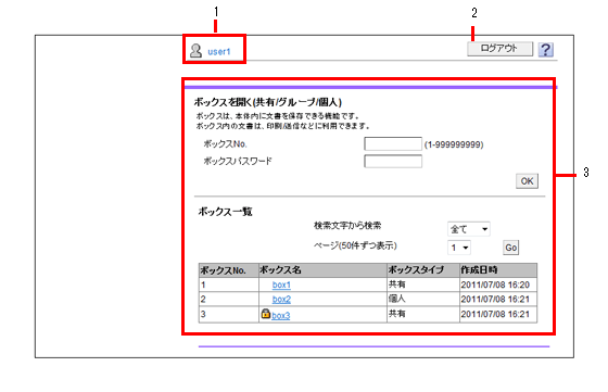 3 | 内容の表示 | Web Connectionの内容が表示されます。 本機のWebブラウザーを使用してアクセスするときは、ボックス機能が表示されます。 |