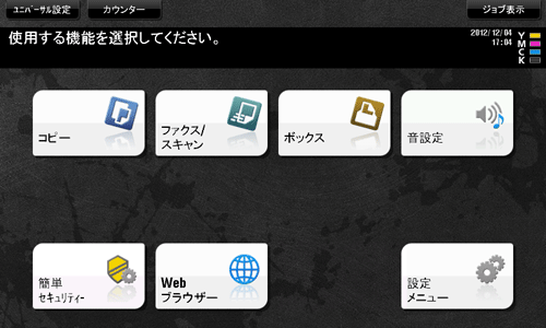 トップメニューには、よく使う機能や、設定メモリー(コピープログラム、ファクス/スキャンプログラム)へのショートカットキーを、自由に配置できます。