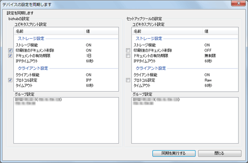 設定値を同期する本体名を選び、[設定値を同期する]をクリックします。