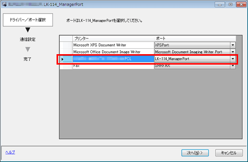 使用する本体のポートを[LK-114_ManagerPort]に変更し、[次へ]をクリックします。