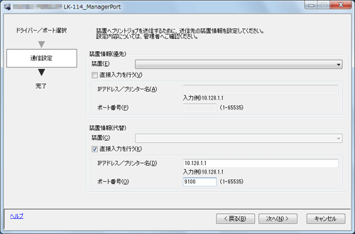 装置定義ファイルがない場合は、[直接入力を行う]にチェックをつけ、IPアドレスを入力します。[ポート番号]は本体の印刷ポートを入力します。
