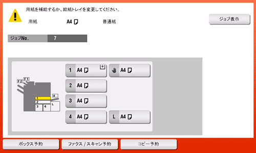 印刷中に用紙がなくなると、用紙の補給をうながすメッセージが表示されます。用紙のサイズと種類を確認して用紙を補給するか、別のトレイを選択してください。