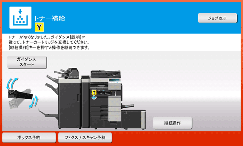 ブラック以外のトナーカートリッジやイメージングユニットが交換時期に達している場合は、ブラックで強制印刷できます。[継続操作]をタップして、印刷するジョブを選んでください。