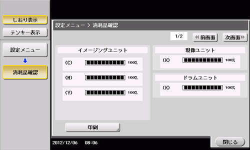 タッチパネルから、消耗品の状態(消費量レベル)を確認できます。必要に応じて、リストに印刷することもできます。