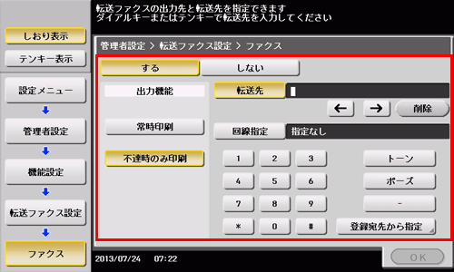 [出力機能] | 転送したファクスを本機でも印刷する場合は、[常時印刷]を選びます。転送できなかったファクスのみ本機で印刷する場合は、[不達時のみ印刷]を選びます。 |
