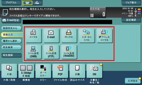 [ファクス/スキャン]をタップし、[直接入力]から宛先の種類を選びます。