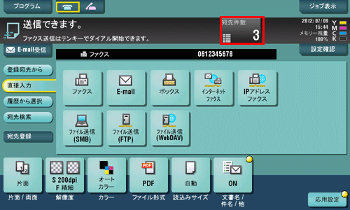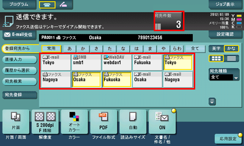 短縮宛先は複数選べます。[宛先件数]をタップすると、同報宛先リストを表示し、指定した宛先の確認や削除ができます。