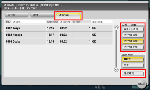 [通信リスト]タブの[レポート種類]でレポートの種類を選び、[選択確定]をタップしてからスタートを押します。