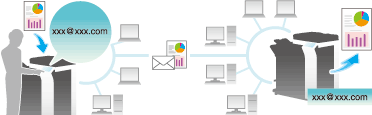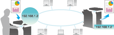 イントラネット内では、IPアドレスファクスを利用できます。IPアドレスファクスは送信先ファクスのIPアドレス、ホスト名、メールアドレスのいずれかを指定して、相手に直接ファクスを送信できます。メールサーバーは必要ありません。