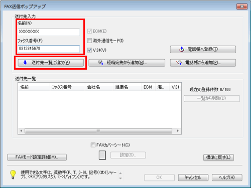 送信先の名前とファクス番号を入力し、[送付先一覧に追加]をクリックします。