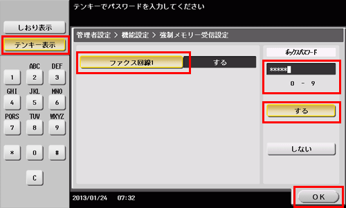 回線を選んでから[する]をタップし、ボックスに保存したファクスを操作するためのパスワードをテンキーで入力し、[OK]をタップします。