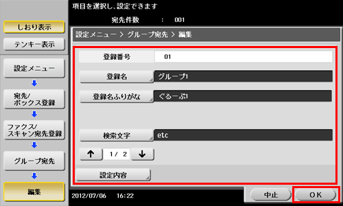 [登録名] | グループ宛先の登録名を入力します。半角24文字、全角12文字まで入力できます。 |