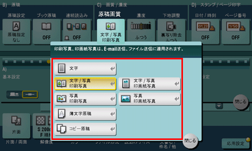 [応用設定]をタップして[原稿画質]を選び、送信する原稿の内容にあった画質を選びます。