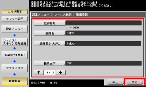 [登録名ふりがな] | 登録名のふりがなを入力します。半角24文字、全角12文字まで入力できます。 入力しておくと、宛先を登録名順に並替えることができます。 |