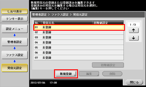 [ファクス設定]-[発信元/ファクスID登録]-[発信元]を選びます。