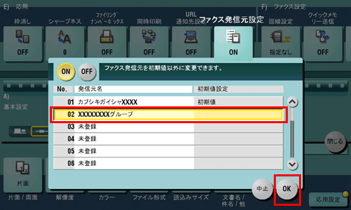 ファクスに印字する発信元名を選び、[OK]をタップします。