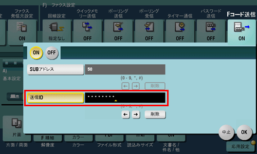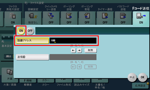 [ON]をタップし、[SUBアドレス]に相手機の親展受信ボックス番号をテンキーで入力します。