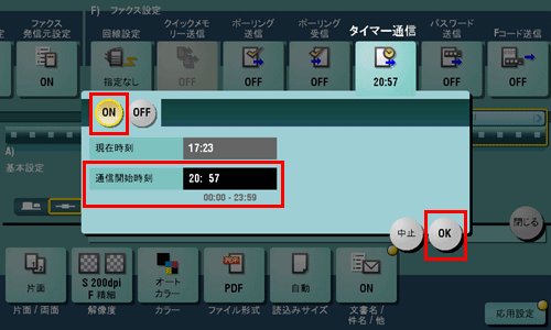 [ON]をタップして、ファクスを送信する時間をテンキーで入力し、[OK]をタップします。