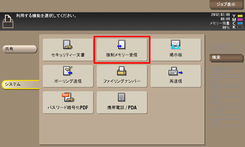[ファクス設定]-[機能設定]-[強制メモリー受信設定]を選びます。