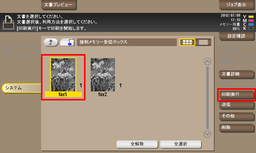 ファクスが印刷され、強制メモリー受信ボックスから自動的に削除されます。