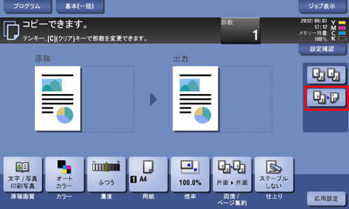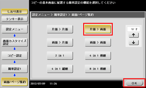 [画面カスタマイズ設定]-[コピー設定]-[簡単設定1]/[簡単設定2]を選びます。