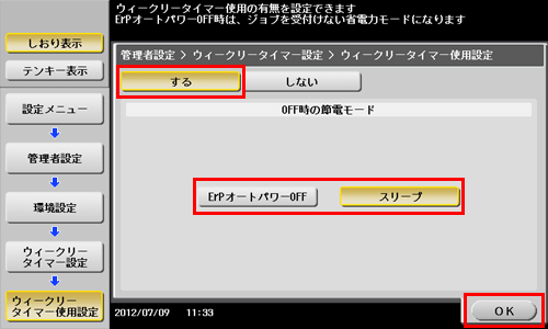 節電モード時にジョブを受付ける必要がなく、より消費電力を抑えたい場合は[ErPオートパワーOFF]を選びます。