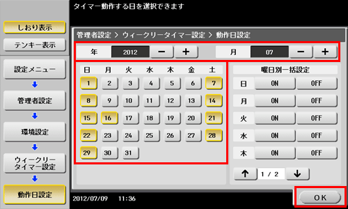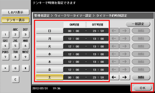 ウィークリータイマーを設定する曜日を選び、ON時刻とOFF時刻をテンキーで入力して、[OK]をタップします。
