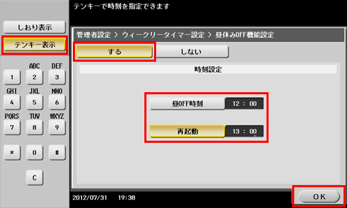 [する]を選び、節電モードに切換える時間帯をテンキーで入力して、[OK]をタップします。