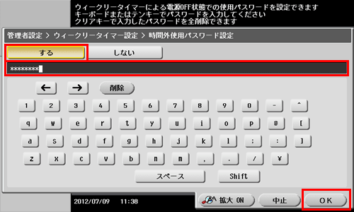 ウィークリータイマーによって本機が節電モードのときの使用をパスワードで制限する場合は、[時間外パスワード設定]をタップします。