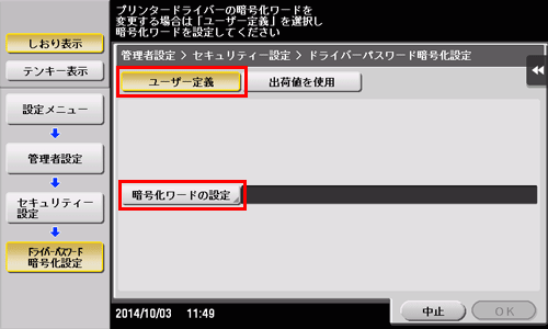 1. [設定メニュー]-[管理者設定]-[セキュリティー設定]-[ドライバーパスワード暗号化設定]をタップします。