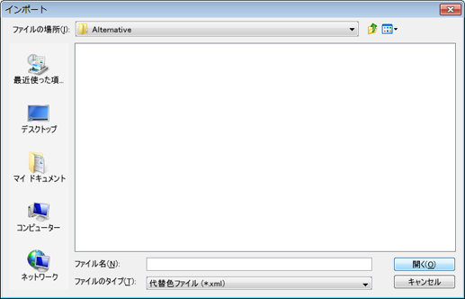 [代替色管理]画面で[ファイル]メニューから[インポート]を選択します。