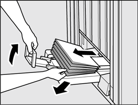 用紙送出し取手を持上げて、出力紙を送出し、折りトレイからすべて取出します。