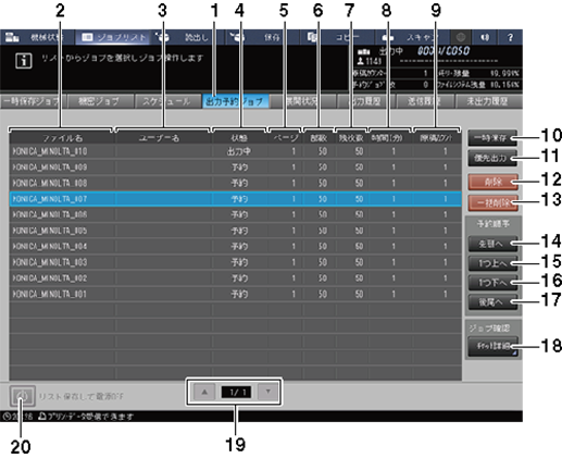 20 | [リスト保存して電源OFF] | 停止中のジョブやそれ以降の出力予約ジョブを翌日継続するときに押します。 |