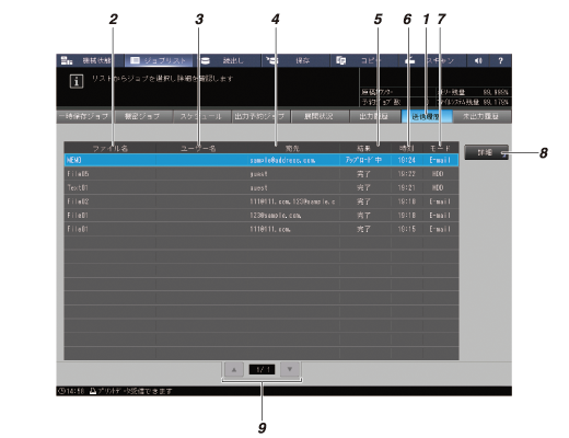 7 | [モード] | 送信ジョブのモード(Email / HDD / FTP / SMB / WebDav /Queue*1 / USB*2 / TWAIN) を表示します。 複数の宛先を選択しているときは、1 つだけ表示(優先順位は、Email - HDD - FTP - SMB - WebDav - Queue*1 - USB*2 - TWAIN)されます。 *1:イメージコントローラー IC-313装着時だけ表示されます。 |