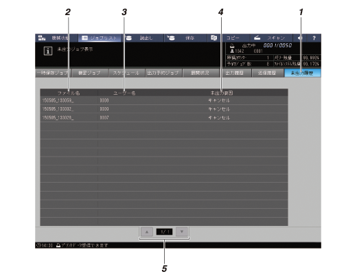 [ジョブリスト]画面の[未出力履歴]画面は、未出力履歴をリスト表示します。