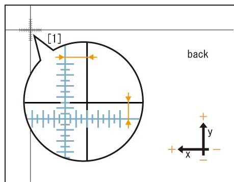 が、オモテ面よりX方向のプラス側に2.0 mm、Y方向のマイナス側に1.5 mmズレているときは、[1]はウラ面の青い線をX方向のマイナス側に2.0mm、Y方向のプラス側に1.5mm移動させたいので、Xは[2][0][+/-]の順に押して-2.0、Yは[1][5]の順に押して+1.5を入力して補正します。